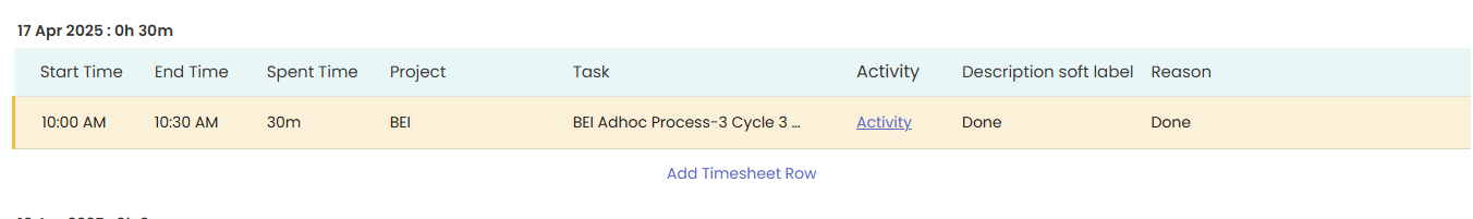 Step 3: Now you can see the "Add Timesheet Row" below the required date. So, click on Add Timesheet Row for which day you are going to submit the timesheet.